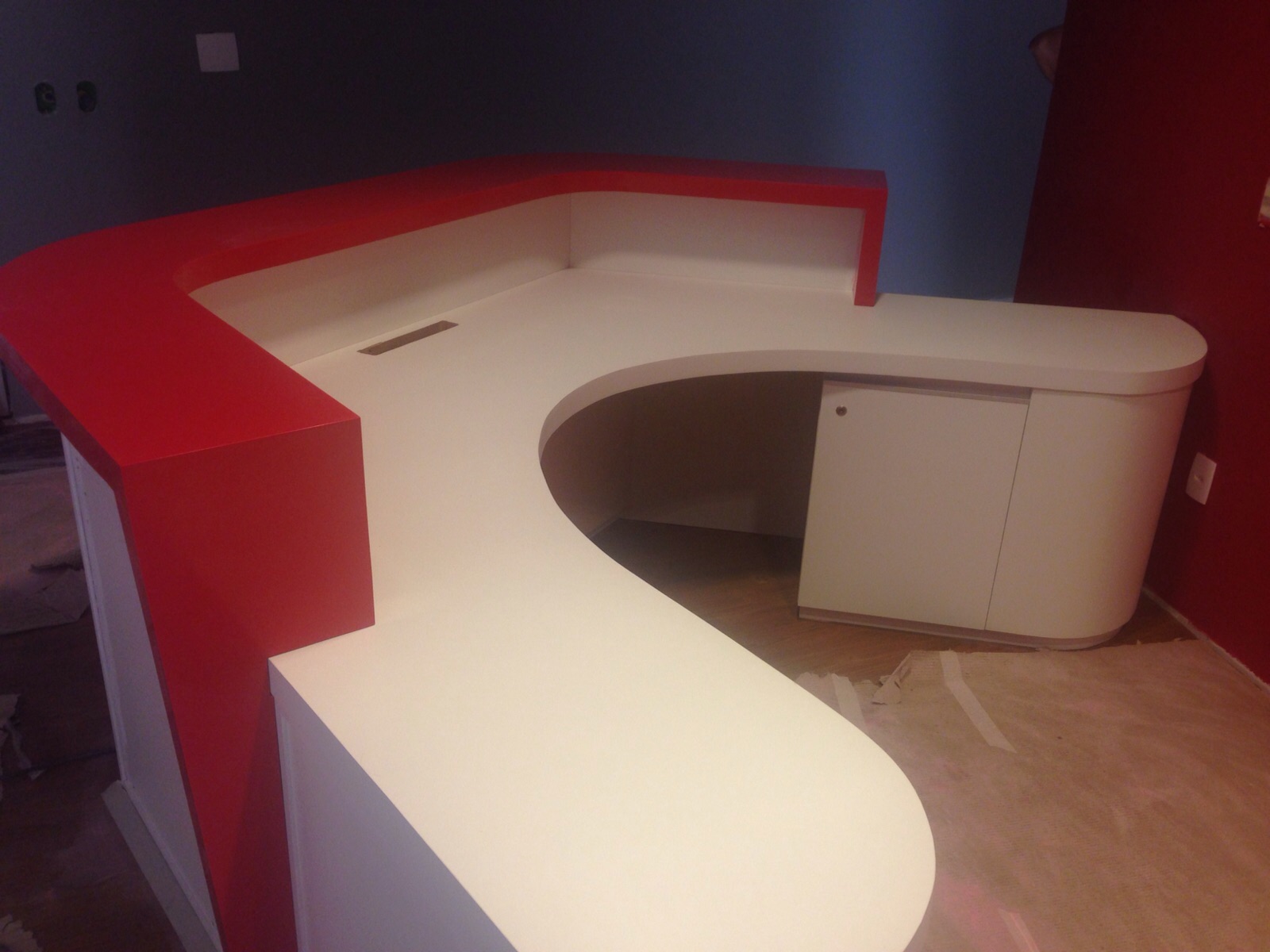 Criamos extensas bancadas de recepção e pias de banheiro que parecem ter sido esculpidas em um único bloco. Sem vincos para acumular sujeira.